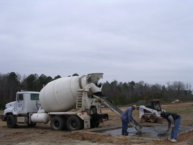 | Then it was time for some concrete. Thompson Concrete Company sent out the raw materials, and then Lamont's crew did their handiwork. I think that the crew got a little tired of me hanging around watching their every move and taking pictures, so I left and went deer hunting. One of my tree stands is about 1/4 of a mile away, so it is very convenient. | |