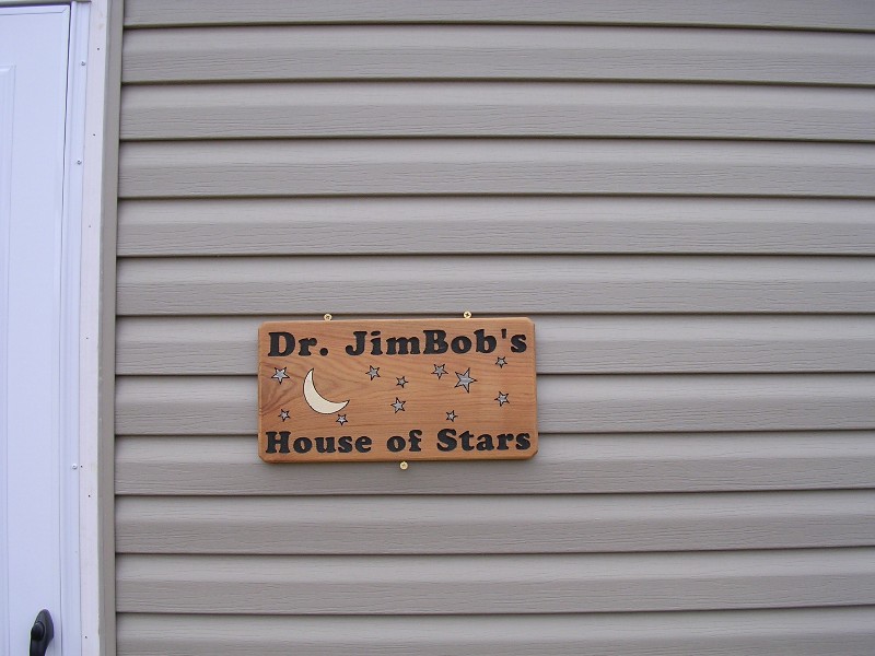 | The House was built by Scott Horstman who owns Backyard Observatories. It is 20 foot long and 16 foot wide. It is divided up into a 14 x 16 non-insulated/unfinished section where the primary telescope resides and a 6 x 16 insulated section referred to as the "warm room" where people can sit in to get warm or cool, as the case may be, in between views at the telescope. It is basically a pine stud frame, with compressed wood walls and vinyl siding on the outside. The warm room has insulation and wood paneling. The roof is aluminum. It is amply wired to power most equipment you might ever want to use, and it includes both red and white lighting so you can maintain your night vision throughout the evening but still have light to do various tasks. | |