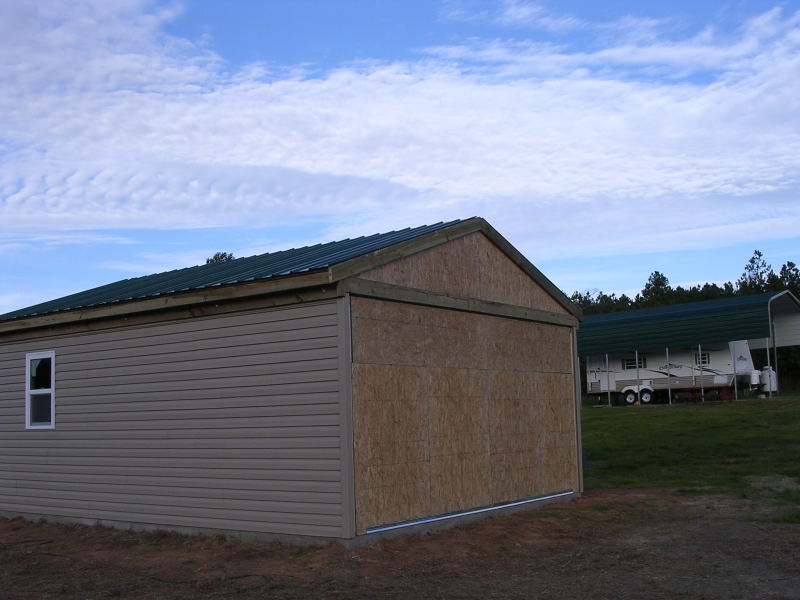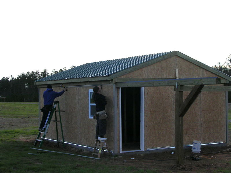 This is the front wall of the observatory (i.e., the south wall) prior to the siding installation. If you look closely, you can see that a 2 x 16 foot section of the upper wall is cut. (Look at the section right below the 2 x 4 stud running across the top of the wall.) This part of the wall is actually hinged, so that one can fold it down after the roof is rolled off. This gives far less obstruction to the southern sky. |