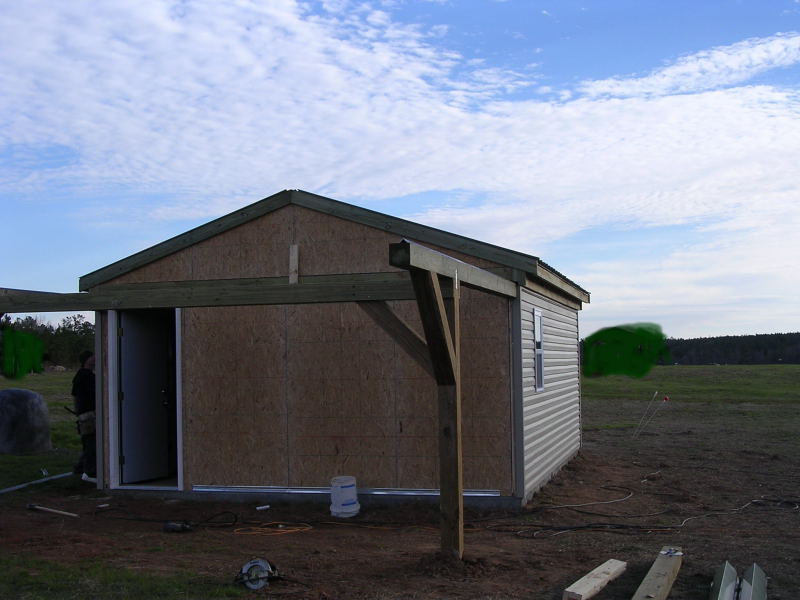| You can see the 6" x 6" treated studs that are attached to the rear of the observatory. They form a frame onto which the roof rolls when you uncover the telescope room. The roof movement is actually performed by an electric motor with limit switches so that it automatically knows when to stop moving even if you are still pressing the "roll" button from inside the observatory. Both the outside frame, seen here, and the inside frame have a track that the roof sits on. There are little 2-inch "v-groove" rollers attached to the roof, itself, and these rollers sit on top of the track. The motor pulls the roof along the track for easy opening and closing. | |