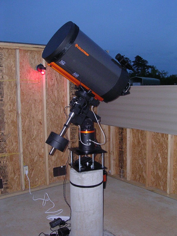 This is the primary telescope at "The House". It is a Celestron CGE 1400. (CGE stands for computerized German equatorial mount.) This has been a wonderful scope. After some initial collimation problems, it has performed like a champ for almost two years! I have only had to realign it once in all that time, and that was because I accidentally cut the power to the scope, and I did not know that I could restore the previous alignment. (I never was much for reading manuals.) The scope has a GPS accessory and a built-in computer database of astronomical objects. I just hit a button or two, and it slews to the appropriate place in the sky so that I can have a look. I love this scope! The scope sits on a concrete pier that sinks into the ground about two feet. It might not be pretty, but nothing beats a concrete pier for stability in my opinion. BTW, you can see the south wall folded down inside the observatory in this picture. |