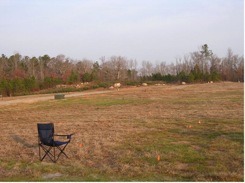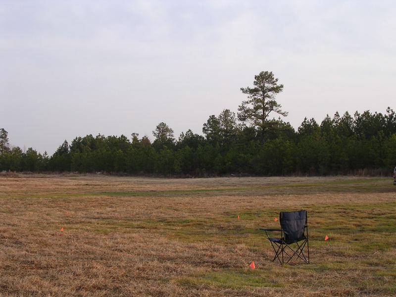 The first stage of the construction process was the "stakeout." Various locations at the site were tried in an attempt to optimize both the views from "The House" and potential for future development at the site (e.g., a future home or cabin). This picture shows the northwest horizon from the ultimate location. Small orange flags were used to mark the observatory corners, the pier location, the warm room location, and the length of the roll-off roof frame. A chair was placed at the pier location so that I could examine the views of the night sky from the chosen location. |